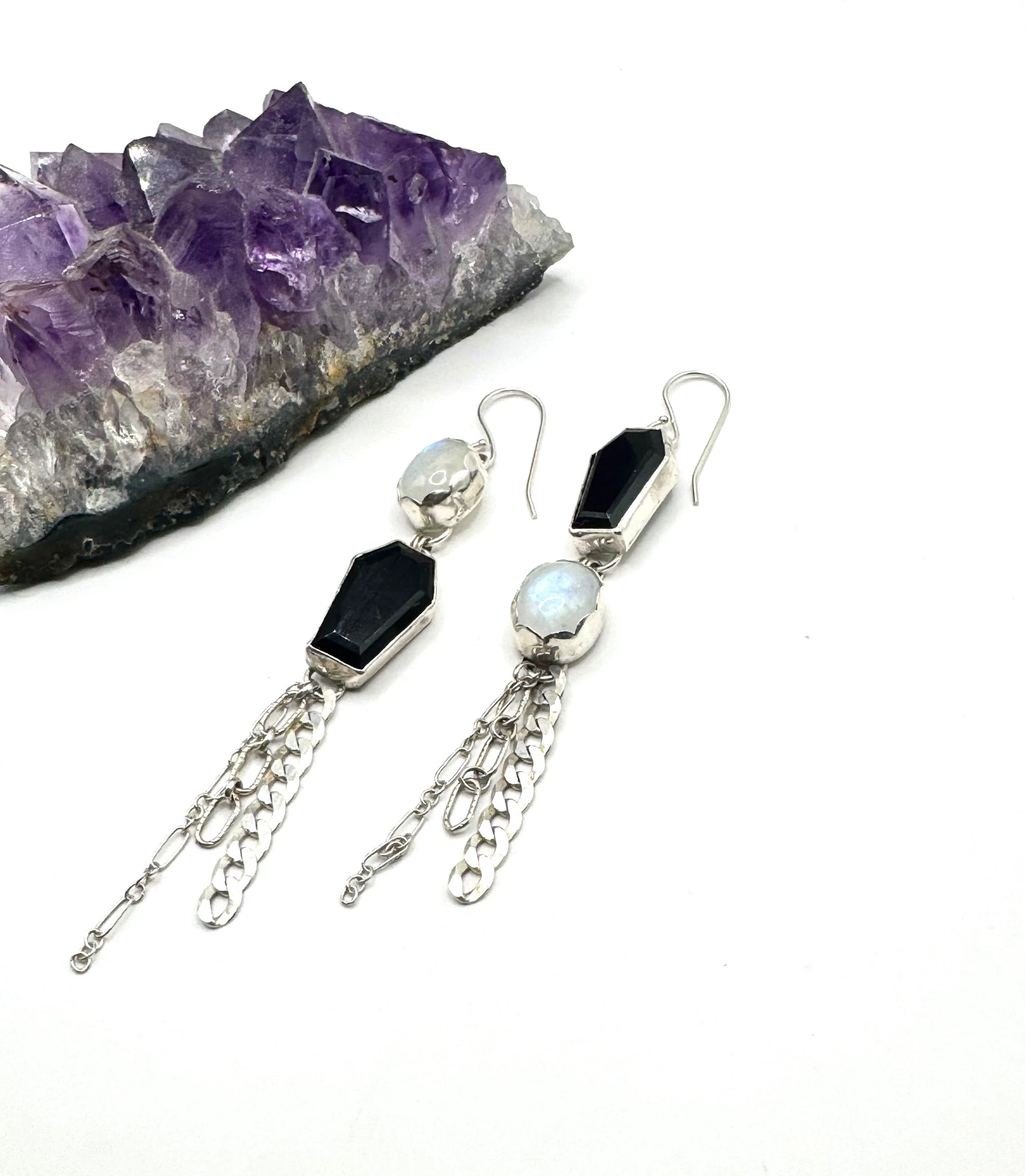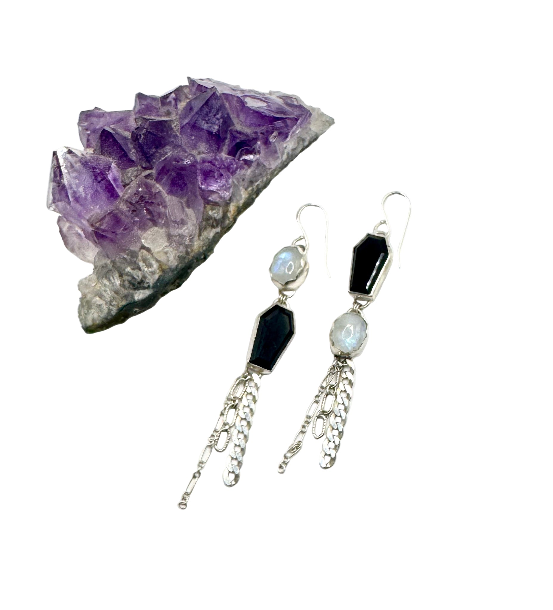 Handcrafted in sterling silver, these unique earrings feature polished black onyx coffins paired with glowing rainbow moonstones, each bezel set with care. Three delicate strands of silver chain dangle from each piece, adding movement and a touch of magic to your look.